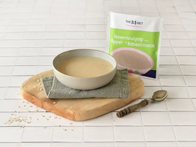 Papmix van magere melk, volkorenmeergranenmeel en appel-kaneelsmaak. Met zoetstoffen. Maaltijdvervangend product voor gewichtsbeheersing.