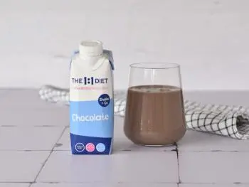 Shake van magere melk en melkeiwit met chocoladesmaak. Maaltijdvervangend product voor gewichtsbeheersing.