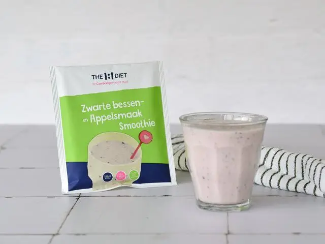 Smoothiemix van magere melk en yoghurt met zwarte bessen en appelsmaak. Met zoetstoffen. Maaltijdvervangend product voor gewichtsbeheersing.